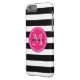 Elegant black and white stripes pattern. Hot pink round frame. Personalise it with your name or monogram initials. Click on the "customise it" button for further customisation options. Choose font style and colour.