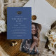 This chic blue grad cap photo graduation party invitation is perfect for a modern outdoor party. The simple design features classic royal blue and white typography with a black and gold watercolor graduation hat.