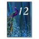Elegant wedding reception table number card, with graphics of a rich turquoise blue coloured satin looking background, with a blue flourish with a colourful peacock. Personalise the white number, for each table at your reception. Matching products available.