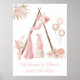 An elegant, Boho chic, Girl Baby Shower Welcome Poster. On a white background, the design is decorated with a wooden tepee tent, an elegant pink curtain, pink dried flowers, balloons and a cake. Personalise by adding your name.