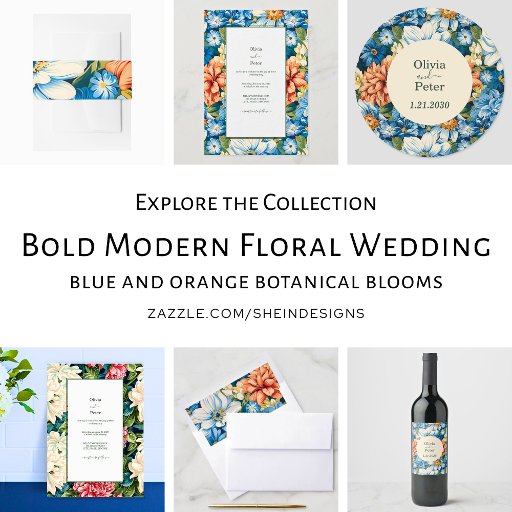 A beautiful floral wedding label featuring bold botanicals—Orange and blue pastel blooms.