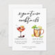 This chic signature cocktails menu sheet features simple black typography above 2 drinks and their ingredients for your wedding bar. A cute Cherry French 75 and Moscow Mule drawing add a cool flair to your bar menu. Complete with the couple's names and date for their reception.