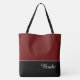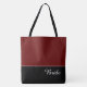 This lovely fashion forward tote bag shows the word "Bride" in white text colour over black with the upper tote bag in custom Merlot. Has plenty of room for personalised text. Graphics and text are on both sides of this tote bag. Black handle. Customise further or buy as shown.