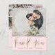 This elegant wedding thank you card features luxurious faux gold calligraphy on a soft blush pink background, paired with space to highlight five of your favourite wedding photos. A modern yet romantic two-sided design, it’s the perfect way to share memories from your big day while expressing heartfelt gratitude to friends and family. Fully customisable with your own images and message, this blush and gold thank you card makes a timeless keepsake. Ideal for bride and groom thank you cards, wedding photo stationery, or personalised post-wedding notes.
