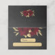 Chic and elegant wedding place card featuring beautiful burgundy flowers and some elegant gold leaves .