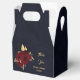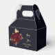Chic and elegant navy wedding favour box featuring beautiful burgundy flowers and some elegant gold leaves.