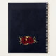 Chic and elegant navy blue wedding planner featuring beautiful burgundy flowers and some elegant gold leaves .