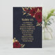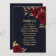 Chic and elegant seating navy blue chart table number card featuring beautiful burgundy flowers and some elegant gold leaves.