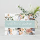 Elegant flat thank you cards feature six of your favourite wedding photos in a collage layout with a sage green stripe running through the centre. "With love and gratitude" or your custom message appears in white calligraphy script, with your names and wedding day beneath. Personalise the back with a pre-printed message, or delete the sample text if you prefer a handwritten note.