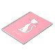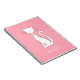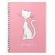 Fun and girly pink notebook with a cute chic white cat with a pink nose and collar sitting sideways, smiling and turning to look at you with her whiskers and tail in silhouette. You can personalise your name below in a trendy white contemporary script.