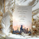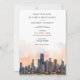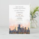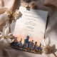 Announce your upcoming wedding with this sophisticated invitation, featuring the iconic skyline of Chicago, Illinois. The card showcases a stunning watercolor illustration of Chicago’s famous architecture, beautifully depicted with the serene hues of dawn or dusk. The elegant serif and script fonts in warm terra cotta and muted gold add a touch of modern chic. Perfect for couples planning a contemporary urban wedding, this invitation combines the charm of Chicago's skyline with a refined artistic flair.