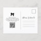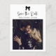 This elegant and chic, black and white wedding save the date postcard features modern, whimsical script. A trendy, black coquette bow and your favourite couples photo are featured on the front. The back has room for your wedding details, and there is also a QR code that guests can scan to visit your wedding website. All colours can be changed, including the bow and script.