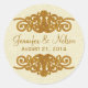 Elegant wedding envelope seal sticker done in a pretty cream and khaki swirl pattern. Graphics of gold tone decorations above and below the golden brown text. Personalise the text, with the bride and groom's names and wedding date. Lovely finishing touch to wedding invitation envelopes and thank you cards.