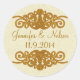 Elegant wedding envelope seal sticker done in a pretty cream and khaki swirl pattern. Graphics of gold tone decorations above and below the golden brown text. Personalise the text, with the bride and groom's names and date, or anything you want it to read. Lovely finishing touch to wedding invitation envelopes and thank you cards.