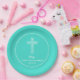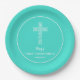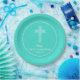 Paper plates with an open weave white cross on an elegant turquoise background are perfect for your child's First Communion, Christening, Baptism, Confirmation or Dedication party or reception. MATCHING invitations and other items in our collection.