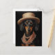 Portrait from a super elegant dachshund with a fancy cream hat, pink scarf and pearls