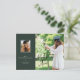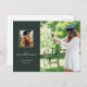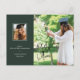This graduation announcement features a stylish dark green background with a large photo and a smaller photograph. Details include the graduate's degree, major, school name, and graduating year with the graduate's name highlighted in a "signature" style handwritten font. This postcard graduation announcement is setup for easy mailing.