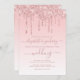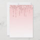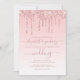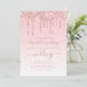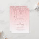A chic, modern design featuring a pink ombre background with a top border of pink glitter drips. The word "wedding" and the couple's first names appear in lowercase calligraphy script with decorative swashes at the beginning and end, with the remaining text in sans serif font. The pink ombre background and glitter drip border are repeated on the reverse. (To keep the swashes, replace only the letters, leaving the symbols in place.)
