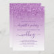 A chic, modern design featuring a purple ombre background with a top border of purple glitter drips. The word "wedding" and the couple's first names appear in lowercase calligraphy script with decorative swashes at the beginning and end, with the remaining text in sans serif font. The purple ombre background and glitter drip border are repeated on the reverse. (To keep the swashes, replace only the letters, leaving the symbols in place.)