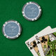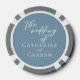This chic dusty blue wedding poker chip features elegant white script for a Vegas themed reception. Simple typography on blue poker chips for your reception guests.