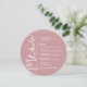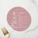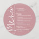 A round dusty rose dinner menu card features your menu choices in chic white lettering, perfect for a modern wedding reception, wedding rehearsal dinner, anniversary party or any special event with a sit-down dinner. Easily personalise with your dinner choices and details. MORE colours in our store.