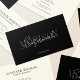 Modern professional script calligraphy business card featuring your name in a stylish elegant script typography design and website address on the front, and full contact info on the back on a black and ivory backdrop.