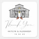 A unique barn illustration in a fall theme with yellow lights and orange pumpkins. This is an elegant rustic design with modern calligraphy and fonts. The couple's names and special date are underneath..