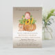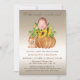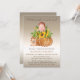 This cute and modern fall couples baby shower invitation features a bronze glitter pumpkin with watercolor sunflowers and a cute baby on the top with an owl to the side on a champagne background. Stylish and chic