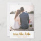Simple and chic wedding save the date card features pretty gold colour and white polka dot print with faux gold "save the date" brush script typography. Simply add your names and favourite photo to make this classic design your own.