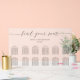 Welcome your guests and let them find their seats on this elegant acrylic sign with the beautiful "find your seat" phrase in modern handwritten calligraphy. Use our 12 tables to add your guest names, and if needed, you can erase tables and even re-adjust the table's positions by selecting "Edit using Design Tool" with the button located at the end of the template text boxes, you can also increase the font size or reduce it to fit your amount of tables best. 12" x 18" is simply our default size, you can choose from several size options. "IMPORTANT NOTE: sign in a high-quality acrylic sheet with the text printed in black and a frosted faux look behind, providing a clear view of the text in all spaces, and giving you the frosted appeal for a fraction of the cost! Small sizes come with a wood block to stand, bigger sizes need an easel or surface to stand so they won't warp. This same sign design is also available in poster print and in foam board options, which you can find in our collection". Part of our "Modern Elegant Wedding and Events Signage" collection with a variety of coordinating products available. Dimensions of sign from demo photo with stand: 24" x 36"