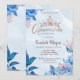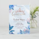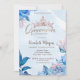 Elegant glitter crown and flowers on blue quinceañera party invitation.