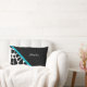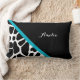 A chic black and white giraffe print lumbar pillow with a trendy aqua blue diagonal stripe. Personalise this graphic animal print design by adding your name. Customise the aqua blue on the reverse side with your own custom colour.