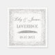 Personalised chic and glam wedding napkin featuring elegant grey text, a silver glitter sparkle confetti border, and a white background. You can easily personalise this napkin with your names, surname and wedding date. You can even change the text colour and font style using the customise option! Perfect for a winter wedding!