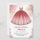 This is an elegant quinceañera invitation card. It features a beautiful illustration of a tiered, ruffled pink ball gown with sequins, centred prominently. The gown is surrounded by floral accents in shades of pink, purple, and green at the corners. The background has a soft watercolor effect with hints of gold glitter, which is also echoed in the gold glitter backing card.