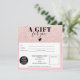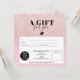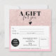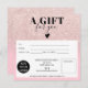 Modern chic pink glitter ombre marble pattern and white simple square gift certificate, add your logo, with a rose gold heart. Perfect birthday or Christmas gift certificate voucher.