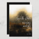 save your wedding date and share your fabulous date with that artistic and elegant card with golden misty watercolor landscape abstract painting with side bride and groom names, save the date typography and details in front and plain black in back.