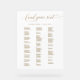 Guide your guests to their seats with this elegant and practical wedding acrylic seating chart sign in alphabetical order—simple, stylish, and clean style. Sign with the "Find your Seat" phrase in elegant calligraphy in a faux gold-foil print, while the rest of the sign's text is in golden hues. Stress-free and friendly for your guests! Use our 3 columns to add your guest names. If needed, you can always select "Edit using Design Tool" with the button located at the end of the template text boxes, and increase the font size or reduce it to fit your guest names correctly, as well as select the column and move their position to accommodate the number of guests correctly. We recommend creating a display with 2 or more signs for events with a great number of guests. 12" x 18" is simply our default size; you can choose from several size options. "IMPORTANT NOTE: Sign in a high-quality acrylic sheet with the text printed in golden tones over a white background. Small sizes come with a wood block to stand, bigger sizes need an easel or surface to stand so they won't warp. Part of our "Minimal, Elegant Wedding and Events Signage" collection with coordinating signage available. Visit the entire collection at: https://www.zazzle.com/collections/119536700311025072. Dimensions of sign from demo photo with stand: 24" x 36"