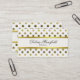Chic business card, with a gold and white polka dot background. Graphics of a gold edged white band text area, stretches across the middle. Black text is ready to personalise, with your information, leaves a glamourous lasting impression.
