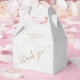 Elegant white on white filigree print pattern with your names and thank you in chic gold lettering on the front, these gable style party favour boxes are beautiful for wedding favours, bridal shower favours or any special occasion.