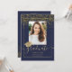 Chic gold confetti navy blue typography graduation, add one of your photo. Class of 2022! Celebrate the graduate. With faux gold foil confetti, geometric frame and cap.