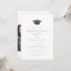 This chic gold grad cap photo double graduation party invitation is perfect for a modern outdoor party. The simple design features classic white and yellow gold typography with a black and gold watercolor graduation hat.