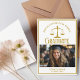 This chic gold custom law school graduation announcement card features elegant modern typography for a class of 2025 graduate above your student photo. Customise with your graduating year under the scales of justice symbol and graduate photograph for a great personalised lawyer or attorney card.