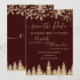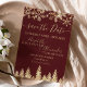 Time to celebrate your winter wonderland wedding theme with this luxury yellow gold glitter snowflakes sparkles and chic gold glitter pine tree forest on an elegant festive dark red burgundy background, featuring a modern cool script font typography. A chic and elegant wedding save the date card.