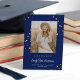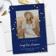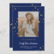 This chic yet whimsical graduation announcement features a deep blue background (customisable), a sprinkling of faux gold stars, faux gold "GRADUATE", and one vertical photo. You can customise this design even further by adding another photo or additional text to the back.