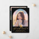 Send your family and friends a unique personalised photo graduation announcement featuring your photo with a modern oval border in black. Below in faux gold script is the word "Graduate" with your name, school and year to personalise accented by a gold graduation cap. The back of the card has a 2nd photo with graduation details. Designed by Susan Coffey.