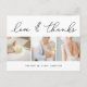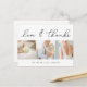 A modern photo thank you postcard designed to accommodate three of your favourite wedding photos in a square format aligned side by side. "Love and thanks" appears along the top in chic handwritten script lettering, with your names beneath. Postcards reverse to show your return address with ample space for recipient addressing, as well as an optional pre-printed message. If you prefer to add a handwritten message, simply delete the sample text shown.