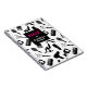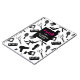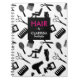 Chic notebook in magenta, black, and white with your name and a pattern of the silhouettes of hairdresser tools.