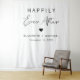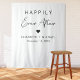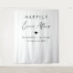 Chic white wedding welcome and photo backdrop tapestry featuring "Happily Ever After" in simple typography and a modern stylish script, a heart and your names and wedding date.