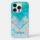 An elegant holographic girly blue iPhone 16 Case. This design creates a futuristic aesthetic with its layered, holographic geometric shapes. The abstract pattern reflects hues of aqua blue, pink and violet catching the light in dynamic ways to give the iPhone case a three-dimensional, high-tech look.