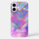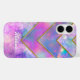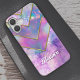 Chic holographic girly elegant blue pink iPhone 16 Case. This design creates a futuristic aesthetic with its layered, holographic geometric shapes. The abstract pattern reflects hues of blue, pink, and violet, catching the light in dynamic ways to give the iPhone case a three-dimensional, high-tech look.